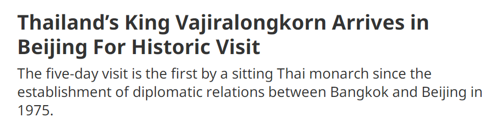 11月13日至17日,泰国国王玛哈·哇集拉隆功携王后素提达对中国展开为期5天的正式访问。这不仅是哇集拉隆功国王继位后的首次访华,更是中泰建交以来泰国国王首次访华。连日来,此访受到了包括泰国媒体在内的多家外媒的广泛关注。