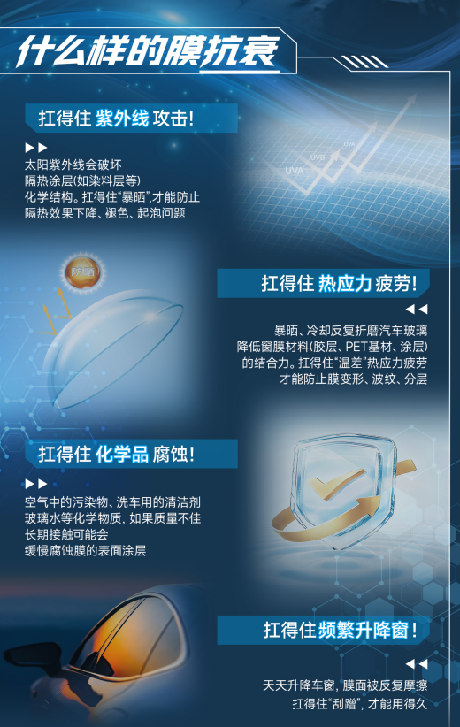 抗热应力疲劳:可承受暴晒、冷却反复带来的热应力,避免膜材料(胶层、PET基材、涂层)结合力降低,防止膜变形、波纹、分层,适应不同季节温差变化。