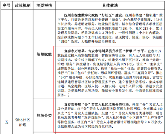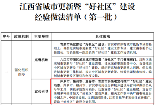 近日,《江西省城市更新暨“好社区”建设经验做法清单(第一批)》公布,宜春市完善“三师进社区”机制、多渠道宣传推广“好社区”建设、开展“分”芳宜人社区垃圾分类行动,以及丰城市破除既有建筑改造审批壁垒、万载县提升社区智慧水平、上高县打造红锦商圈等6条经验做法入选。