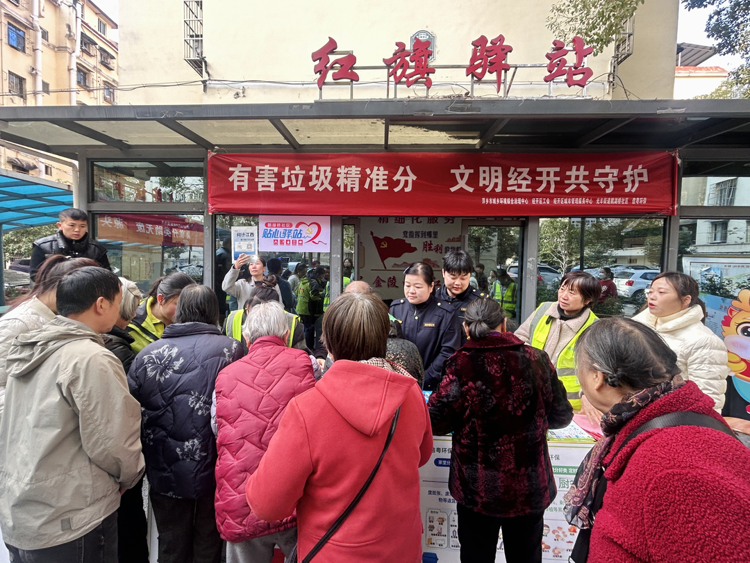 大江新闻讯 周莹报道:为提升居民有害垃圾分类认知,引导形成科学投放习惯,助力文明经开建设,12月4日,由萍乡市城管局、萍乡经开区工会、经开区城市管理服务中心及信粤环保经开区分公司等单位共同举办的“有害垃圾精准分,文明经开共守护”四级联动宣传活动在金陵西区红旗驿站热闹开启。党员志愿者、垃圾分类宣传员与社区居民齐聚一堂,共赴这场垃圾分类科普盛宴。