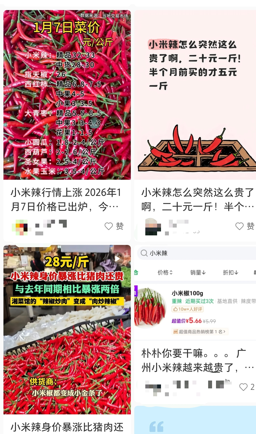 从全国范围看,辣椒价格走高并非个例。据央视财经报道,小米辣、杭椒、线椒等品种价格均高于往年同期,其中小米椒涨幅尤为明显。北京新发地市场一位商户介绍,小米椒价格自2025年10月份开始上涨,从此前的5—6元一斤,上涨至目前的20元左右一斤。