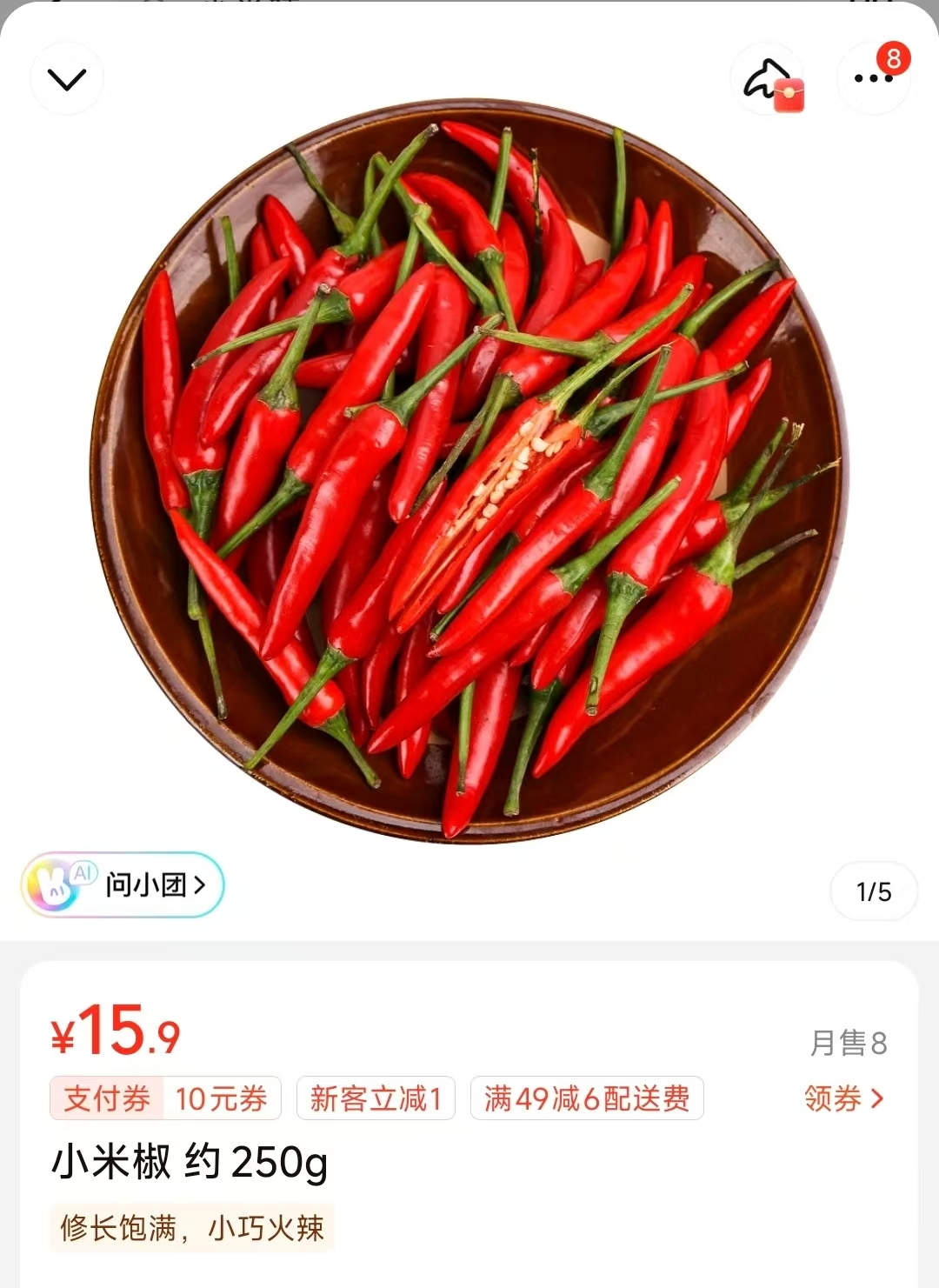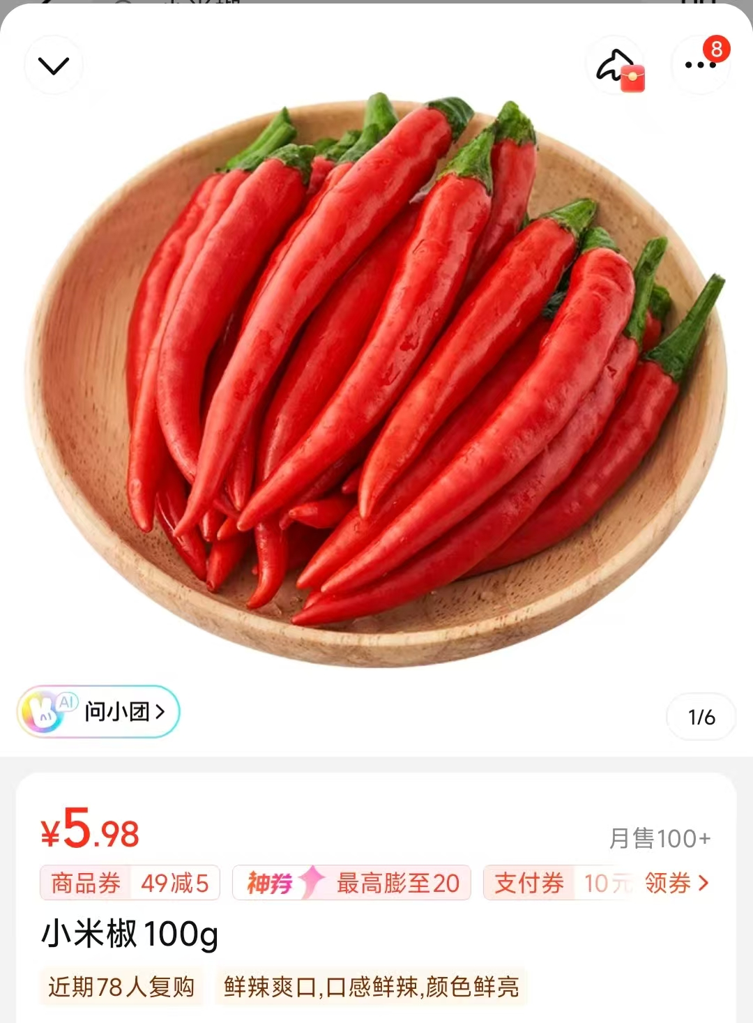 与线下农贸市场相比,生鲜平台的小米椒价格整体偏高。记者在多款生鲜APP上看到,小米椒多以小规格、精包装形式销售,例如按20克一份售卖,单份价格看似不高,但由于重量较轻,折算后整体价格明显高于菜市场散卖产品。此外,平台售价还包含分拣、包装及配送等成本,终端价格因此相对偏高。