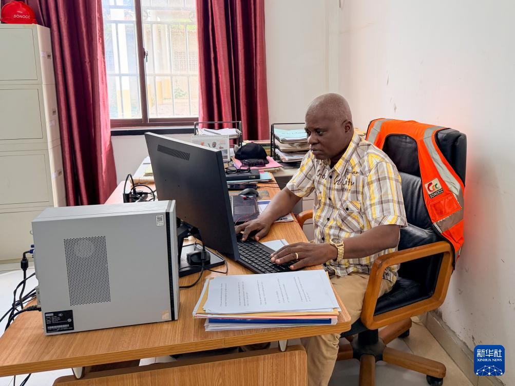 1月24日,在刚果(布)布恩扎省,刚果(布)新水泥厂技术副经理菲代勒·翁东戈在办公室内工作。新华社发
