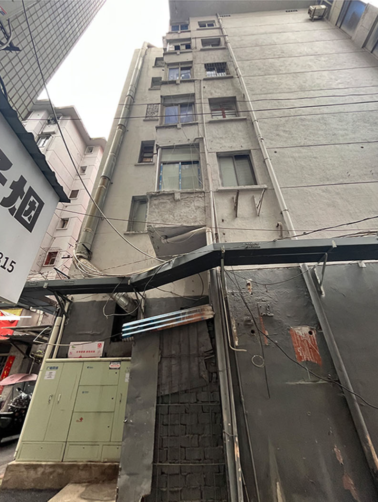 本项目建于80年代,底框砖混结构。立面外墙涂料存在褪色、剥落等问题;门窗多为老旧钢窗或木窗保温隔音性差,外凸防盗网及杂乱的雨棚和店招,影响沿街立面整洁性。