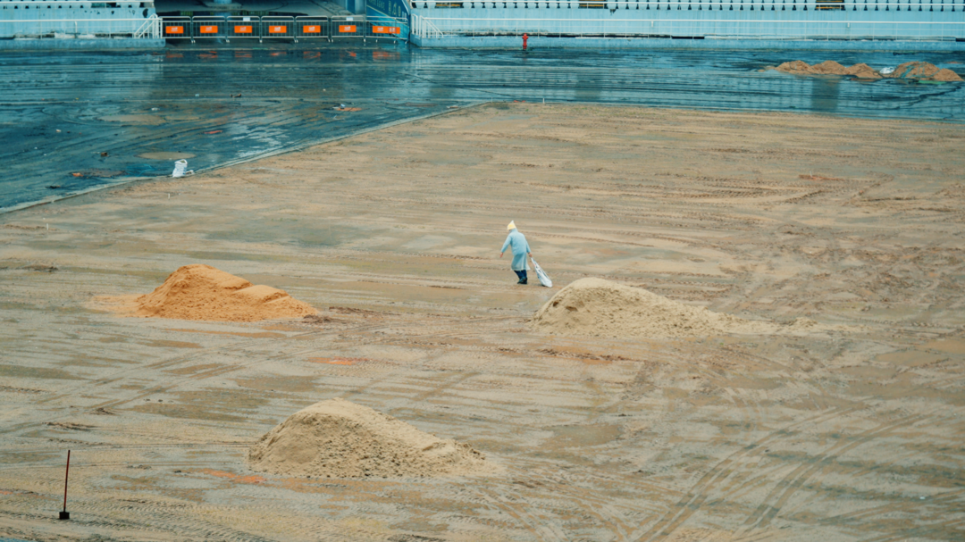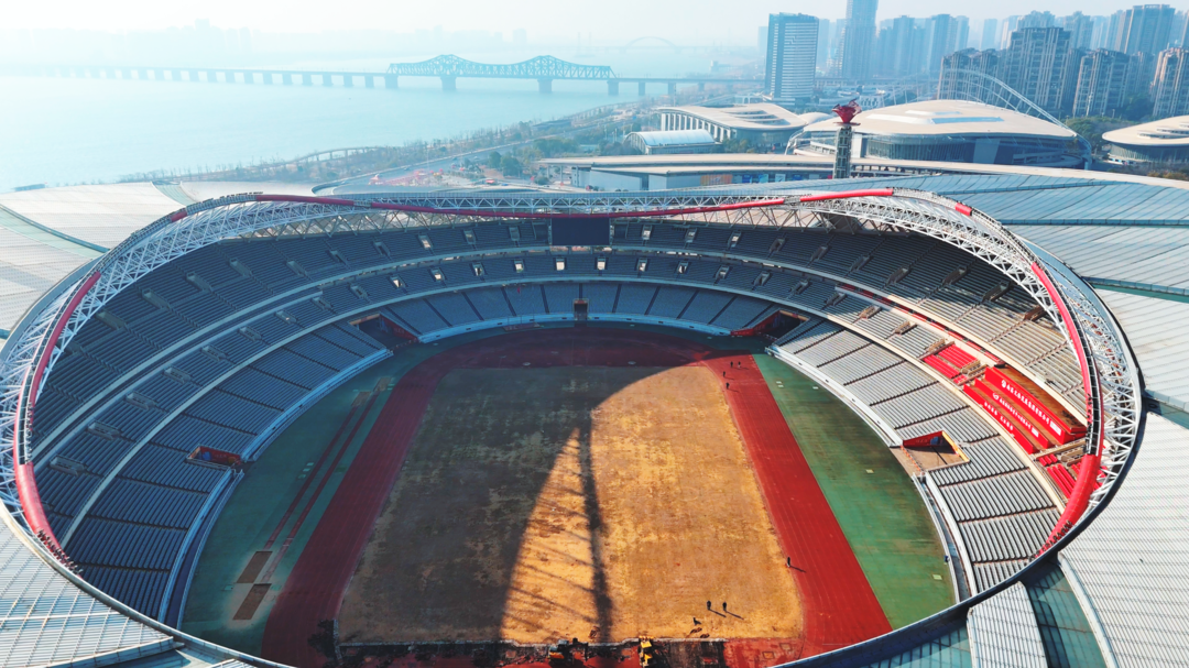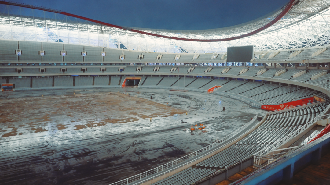 在70米高的体育场穹顶,工人们有序安装灯光设备;正在翻新的主队更衣室内,工人们不停挥着铁铲刮平墙面。受天气影响,挖掘机和推土机暂停了露天球场的工作,原有的草坪早已铲除,覆上了厚厚的沙层;塑胶跑道拆除完毕,等待下一步施工。