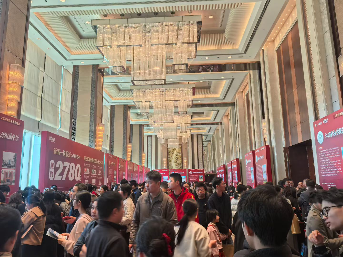 当天上午,咨询会现场人潮涌动,气氛热烈。近30所南昌市公办、民办高中的展位前,围满了手持资料、神情专注的家长。他们或仔细阅读学校宣传册,或就最关心的录取分数、班型设置、师资力量等问题,与招生老师进行细致交流。