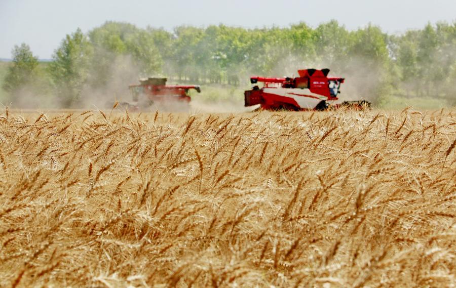 Combine harvesters harvest wheat in the field in Wudalianchi City, northeast China's Heilongjiang Province, Aug. 5, 2025. (Photo by Lu Wenxiang/Xinhua)