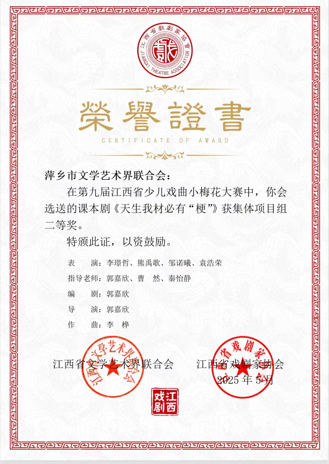 少儿戏曲绽放锋芒,未来可期。第九届江西省少儿戏曲小梅花大赛中,协会选送的课本剧《皇帝的新装》、原创剧目《天生我材必有“梗”》双双获奖,“10后”小演员用稚嫩表演、灵动演绎,诠释戏曲传承的蓬勃生机,让中华优秀传统文化在孩童心中生根发芽。