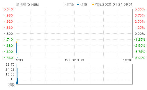 周黑鸭大跌5.0%报4.560港元,成交416.6万港元