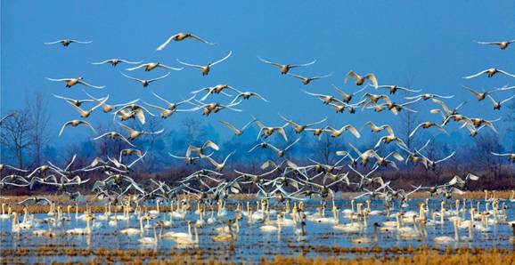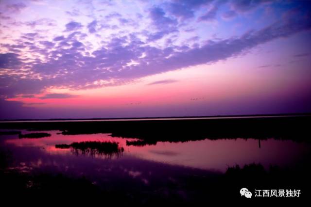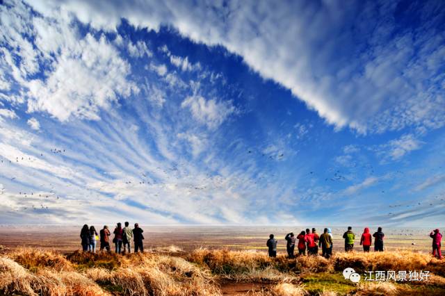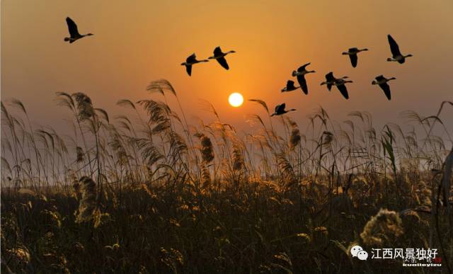 “鄱湖鸟,知多少?飞时遮尽云和月,落时不见湖边草。”冬天,南矶山是候鸟的天堂。寥廓的湿地保护区湖水退落,露出大片大片的浅滩、沼泽和港汊,大量鱼虾、螺蚌滞留浅滩,为候鸟提供了丰富的食饵。在亚热带湿润季风的召唤下,候鸟追逐着季风从遥远的西伯利亚、北大荒等地翩翩飞来,在这里越冬、觅食、繁衍生息。一瞬间,湿地的每一片湖水、每一块浅滩上都洋溢着生命的活力。数不胜数的鹤、鹭、鹳、雁等候鸟成群结队,千姿百态。各种各样的鸟鸣声高亢悠扬,不绝于耳,宣示着她们才是南矶山冬天的主人。她们时而踮着脚在湿地里漫步,时而在湖面上盘旋飞翔,时而一头扎进湖水里捕食。或追逐,或嬉戏,或静卧,或素裳婷立,或翩跹起舞,或展翅翱翔,或用曼妙的身姿挥洒着对湿地的喜爱与眷恋。矶山是看日出观候鸟的最佳之处。