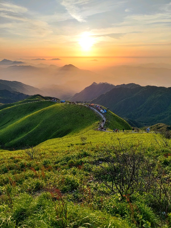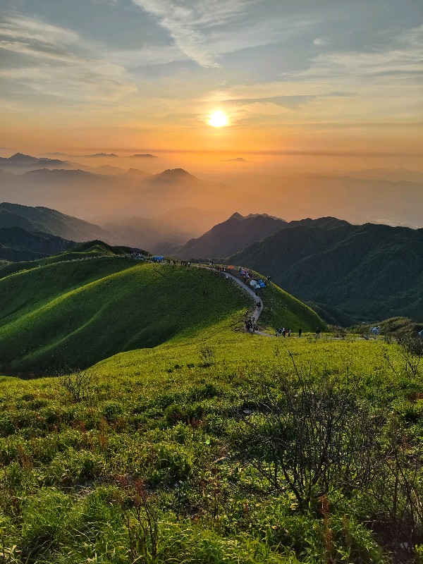 在这云雾缭绕的武功山上,黎明时分,太阳悄然跃出地平线,洒下一片金黄。薄雾弥漫的山峰在霞光中若隐若现,像一幅静谧的画卷。绿草茵茵,为这如画风景增添了一抹生气。游人驻足山顶,在日出的壮丽前,心神陶醉,仿佛时间都停滞了。此情此景,让人不禁感叹自然之壮美,心生敬畏与感激。