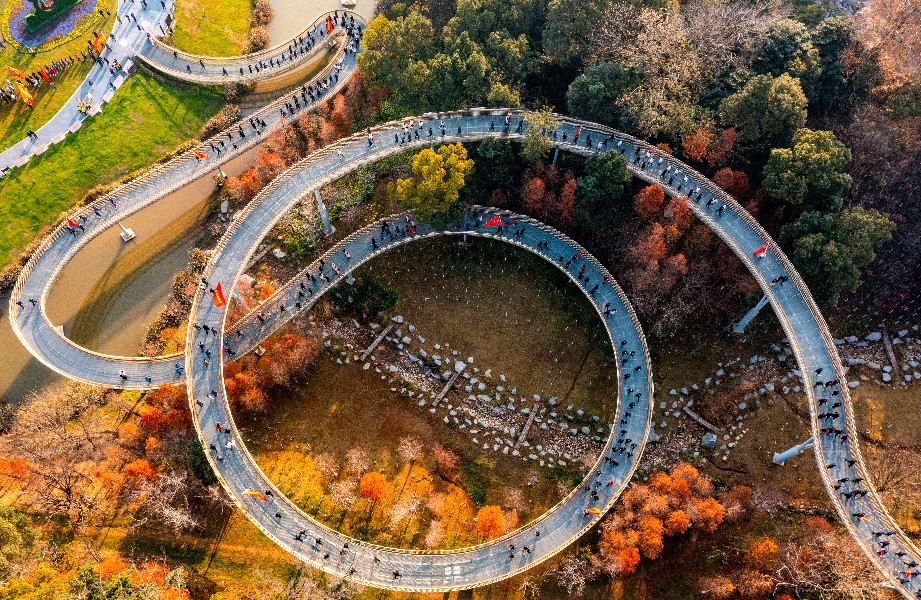 2021年11月30日,市民沿着磨盘山森林公园的步道阔步向前,以积极健康、低碳环保的方式拥抱新年的到来。