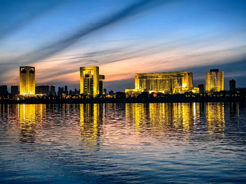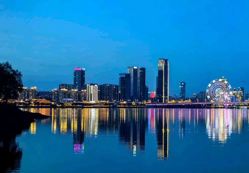 照片拍摄于傍晚时分的朝阳江滩公园。金碧辉煌,在水一方,纵有暮云在天空中舒卷,极力渲染低垂夜色,终不敌这如翡般的城市之光。